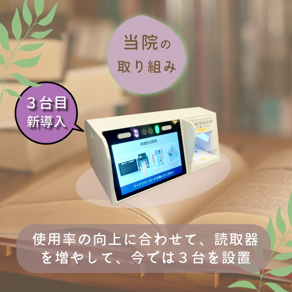 林眼科病院でも、この流れに先立って、受付に設置しているマイナンバーカード読み取り機を2台から3台に増設しました。